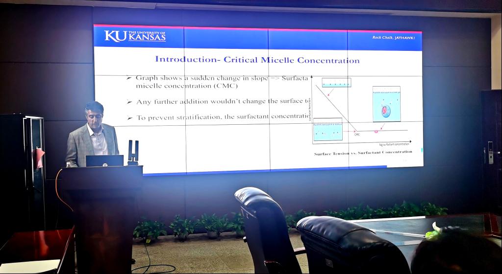报告中,Barati教授首先聚焦高矿化度油藏中CO₂泡沫稳定性差的痛点,重点介绍了聚电解质复合纳米颗粒稳定超临界CO₂泡沫的技术。该技术能有效保障泡沫在长距离运移中的完整性,从而显著提高原油采收率;与此同时,针对浅层河流切割型储层(SFU)开发难题,Barati教授团队创新构建了 “CO₂捕集-驱油-碳储存”一体化技术经济评价体系。该体系以乙醇厂工业捕集CO₂为资源,采用CO₂-水交替注入(WAG)工艺,在实现原油采收率提升的同时,将CO₂永久封存于地下储层,达成“增油”与“减碳”的双重目标。整场报告深入浅出,内容丰富,不仅呈现了前沿技术成果,更为二氧化碳的利用与低碳油田开发提供了新思路。在交流互动环节,现场师生与Barati教授展开热烈讨论。