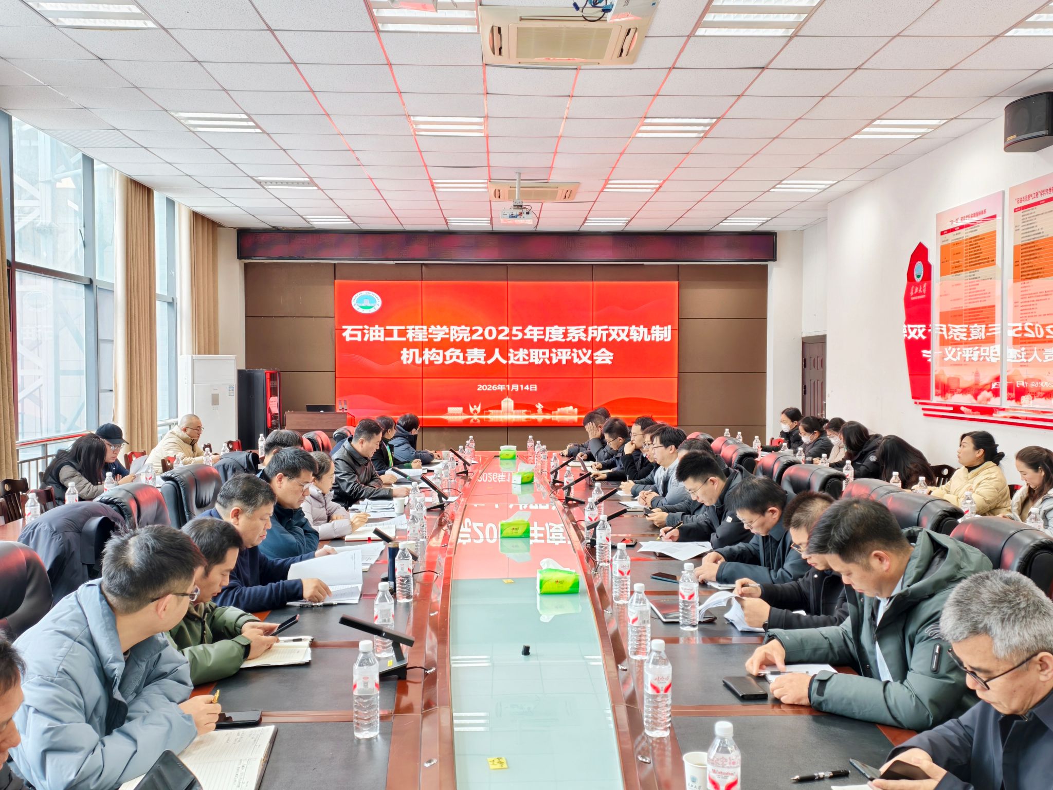 为全面检阅教学研究和科学研究中心年度目标任务完成情况,进一步推进学院机构与机制改革落实落地,1月14日上午,石油工程学院在石油科技B113会议室,召开2025年度系所双轨制机构负责人述职评议会。院领导,学术委员会,教学委员会、教学运行中心、教学研究中心、科学研究中心、实验中心主任及秘书,各研究所所长、各教学团队负责人、系主任、教工党支部书记、全体行政管理人员等60余人参加会议。